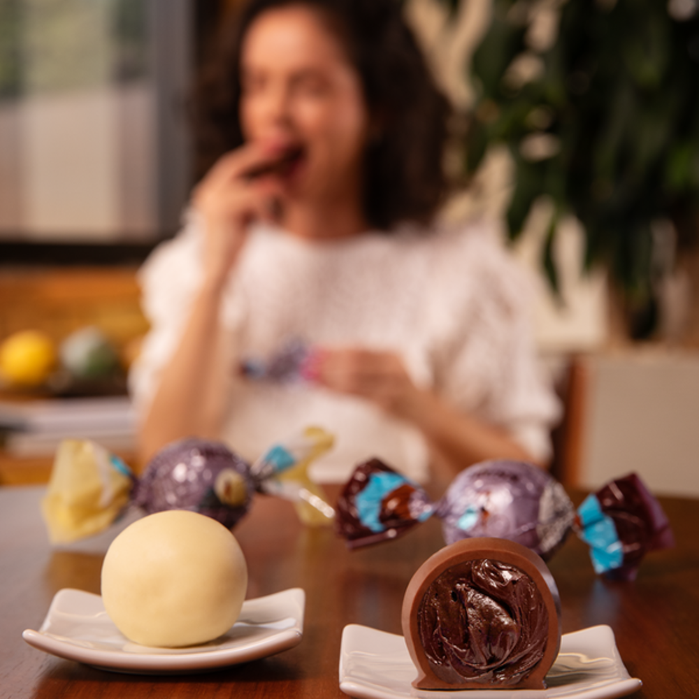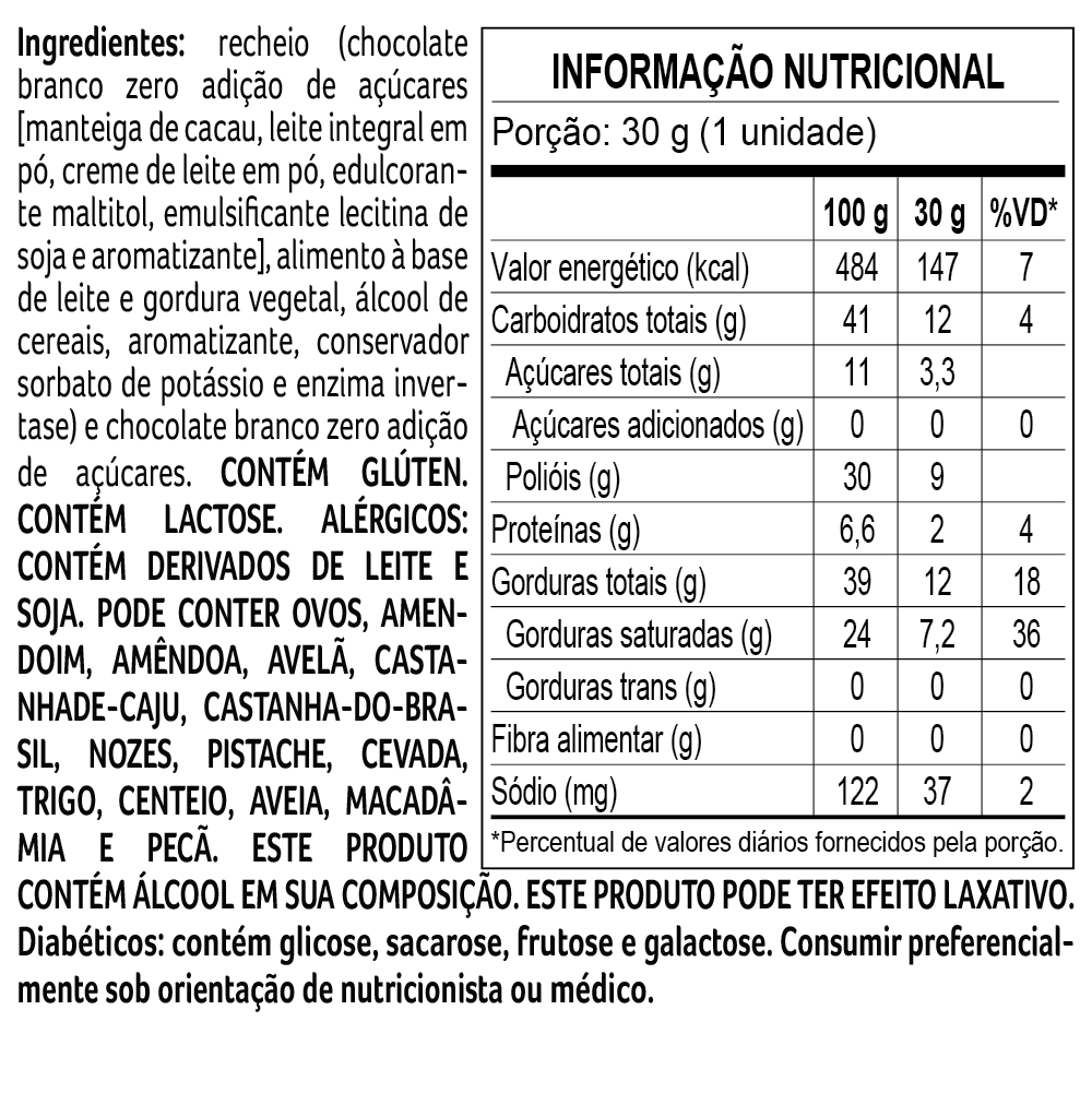 Deliciosa trufa de chocolate branco sem adição de açúcares, com recheio cremoso e sabor marcante!