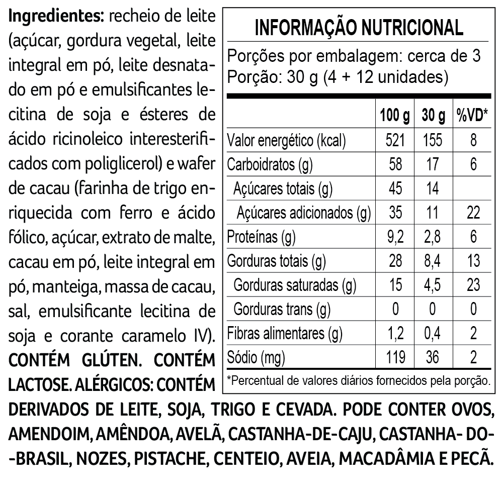 Wafer crocante com massa de cacau e recheio cremoso sabor leite. Sabor e textura em equilíbrio perfeito!