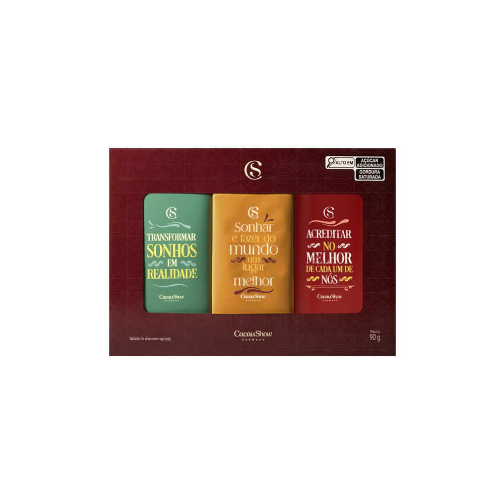 Surpreenda com a Caixa de Tabletes Professores, uma caixa com 3 tabletes de chocolate ao leite com mensagens especiais, para homenagear os professores.